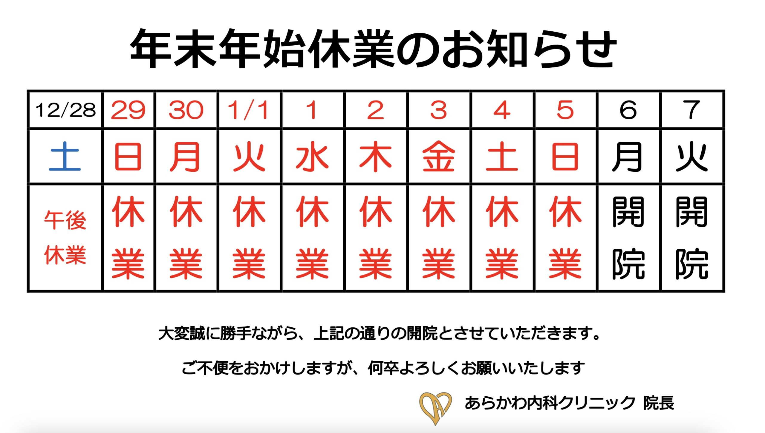 年末年始休業のお知らせ