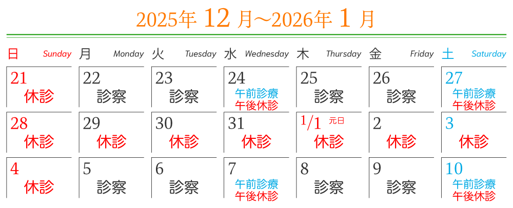 HOME お知らせ 年末年始休診のお知らせ 2025年12月27日(土)午後から2026年1月4日(日)まで年末年始の休診とさせていただきます。 1月5日(月)から通常診療いたします。 ご不便をおかけいたしますが、よろしくお願いいたします。