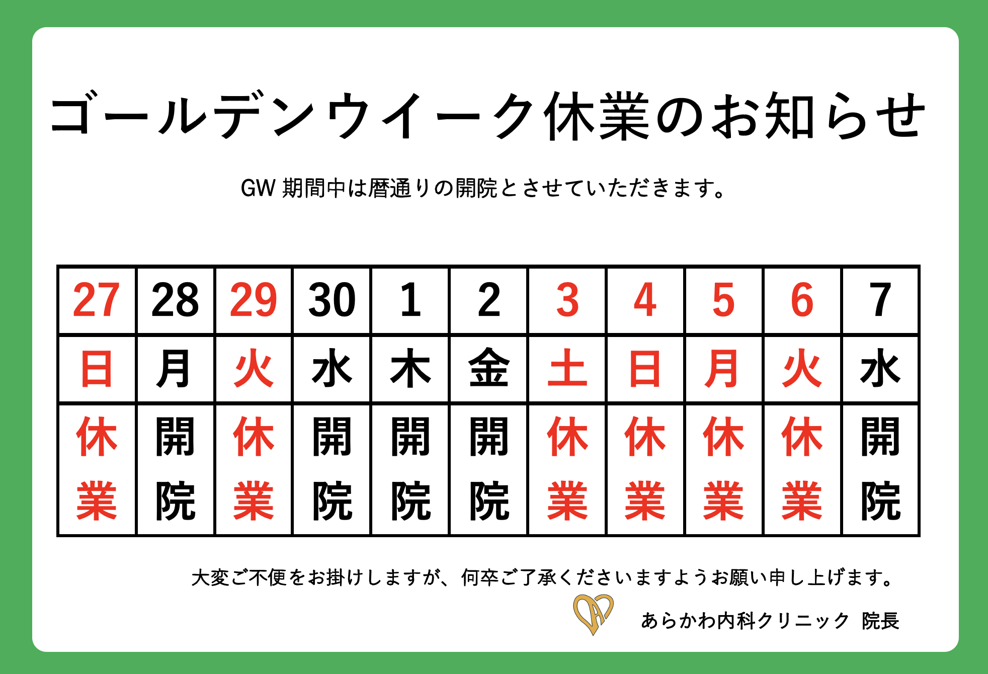 GW中の開院日は暦通りです。お手数をおかけしますが、何卒よろしくお願い申し上げます。